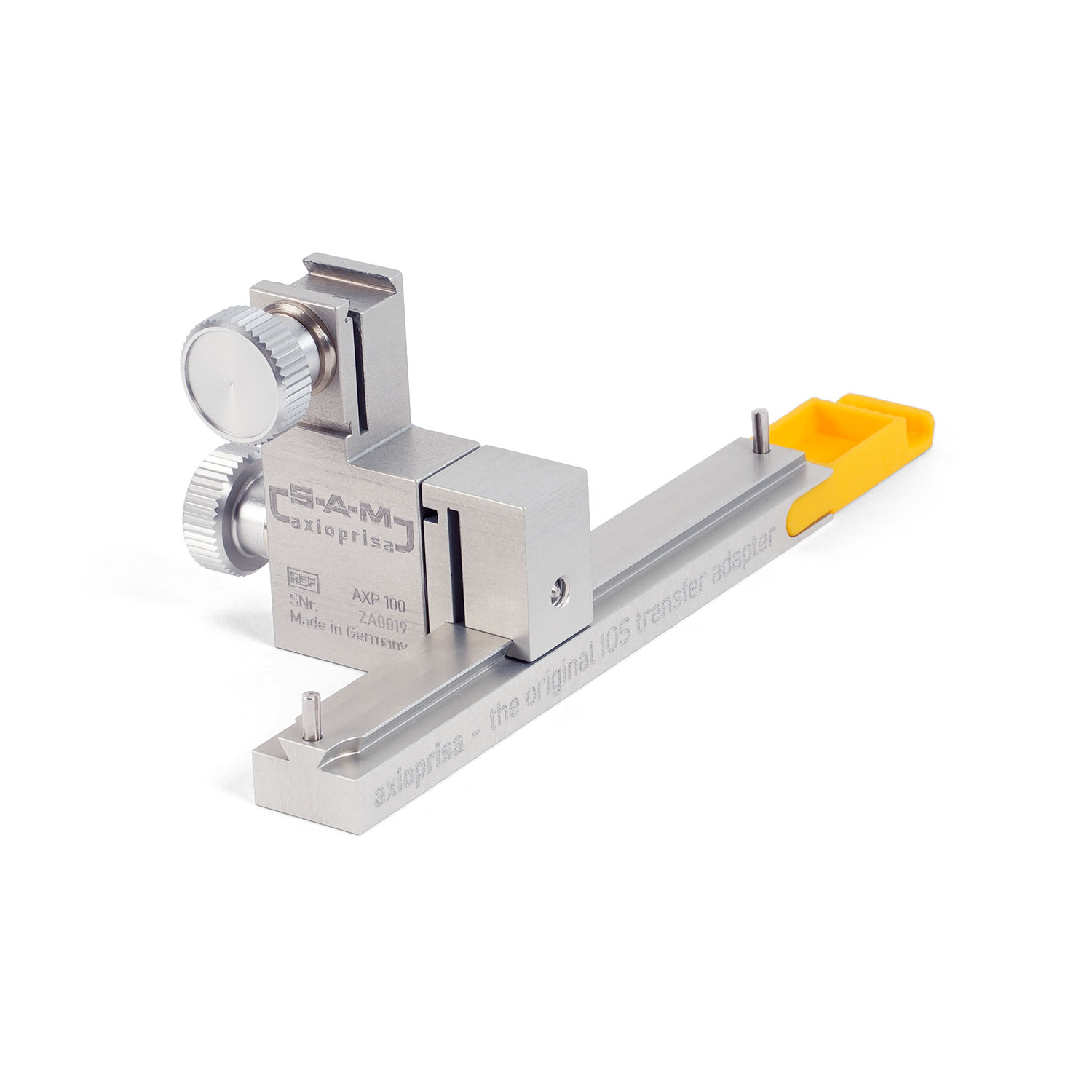 Сборка переноса Axioprisa прикреплена к переносной дуге SAM обычным способом. Благодаря комбинации Axioprisa и переносной дуги можно сканировать верхнюю челюсть в правильном анатомическом положении. Франкфуртская горизонталь — это плоскость, используемая всеми артикуляторами SAM. Используя этот путь, можно переносить положение челюсти с дополнительным сканированием во время внутриротового сканирования. Путь к простым процессам в стоматологической практике позволяет свести источники ошибок к минимуму.