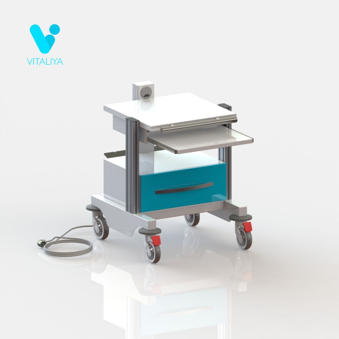 В состав изделия входит одна стационарная полка и одна выдвижная полка. На основании стойки установлен короб с выдвижным ящиком. На задней стенке короба расположены две розетки на два гнезда со шторками. От розеток идёт кабель длиной 2,5 метра. Стойка установлена на колёсные опоры диаметром 125мм, два колеса с тормозом. Колёса оснащены бамперами.