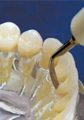 Рабочая часть насадки расположена на её кончике, это последние 2 – 3 мм. Кончик насадки (рабочую часть насадки), следует располагать соосно продольной оси зуба. Насадкой, не погружая её сразу в десневую борозду, необходимо пройти по периметру зуба, убирая доступные для обзора наддесневые (или поддесневые) отложения, без чрезмерного латерального давления. Начинайте работу с лицевой стороны зуба перемещаясь к мезиальному или дистальному краю.