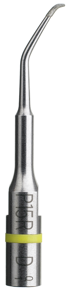 Насадка P15RD «Правосторонняя», для минимально-инвазивной апикальной хирургии. Для ретроградной распломбировки корневого канала премоляров правой стороны нижней и верхней челюсти (при возможности доступа). После выполненной резекции верхушки корня Пьезотомом или вращающимся инструментом. Удлинённая рабочая часть кончика насадки 5мм. Рекомендована для препарирования каналов резцов при апикальной резекции / микрохирургическом эндодонтическом вмешательстве. Ретроградная распломбировка канала такими насадками показана при невозможности прохождения канала в виду наличия в нём индивидуальной литой корневой вкладки, при фиксации на зубе протяжённой ортопедической конструкции. Этот метод позволяет сохранить ортопедическую конструкцию интактной. При полной ревизии корневого канала и резекции верхушки корня вместе с инфицированной дельтой корневого канала, ретроградная пломбировка с применением ультразвкуковых насадок для апикальной хирургии позволяет достичь наилучших долгосрочных результатов. Алмазное покрытие 30 мкм, конусность 7%.