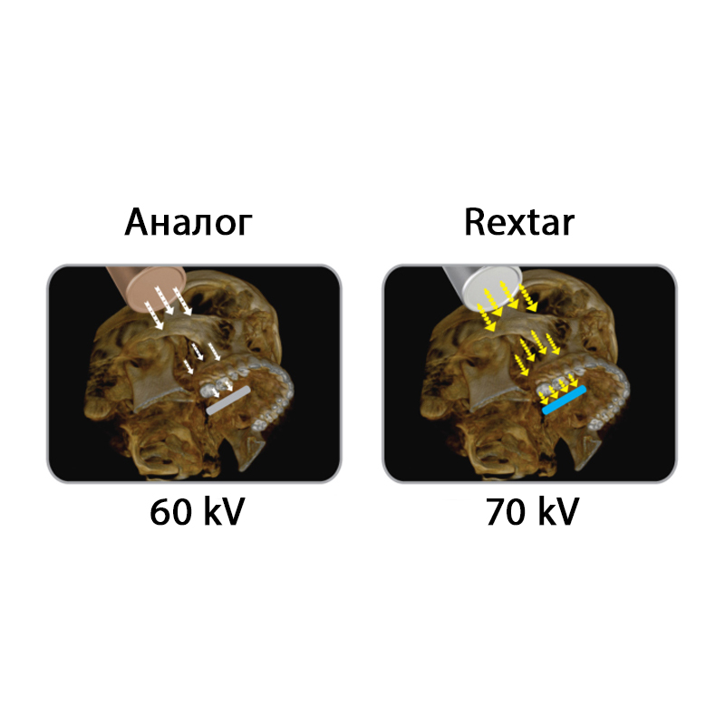Более высокие технические характеристики по сравнению с конкурентами, при напряжении 70 кВ рентгеновские лучи лучше проникают в ткани, на датчик попадает больше информации.