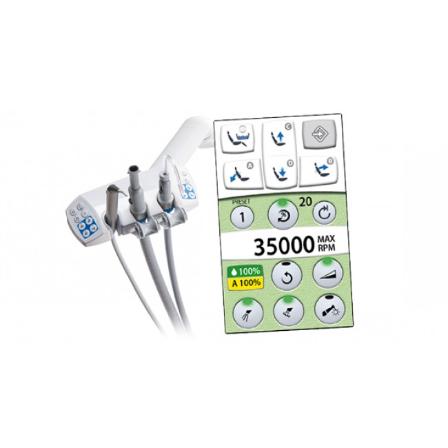 Настройте свою установку персонально под Вас посредством простого многоязычного сенсорного экрана. Подключите нужные инструменты на 6-позиционную консоль и используйте установку легко с первого дня. Расположите установку по желанию для лево/правосторонней работы ручной функцией поворота блока плевательницы и кресла. Удобный и модульный держатель шлангов аспирации и дополнительных инструментов Flexy™ обеспечит все Ваши потребности в лечении.