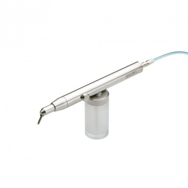 Dento Prep – компактный, полностью автоклавируемый пескоструй для использования с такими абразивами как оксид алюминия и оксид кремния (размер частиц 40-60 микрон). Изготовлен из нержавеющей стали высшей пробы (включая внутренние части и трубки) и может автоклавироваться при температуре до 135 С. Головка пескоструя поворачивается на 360 градусов и может быть установлена в любом направлении.