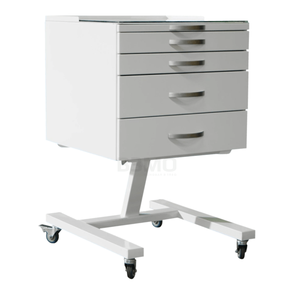 Передвижная тумба имеет четыре ящика на опоре, сверху полка из стекла. По желанию заказчика, так же в столике можно сделать три выдвижных ящика. Опора имеет четыре колеса серой резины Ø50 мм. Столик может использоваться отдельно, а так же отлично сочетаться с набором мебели.